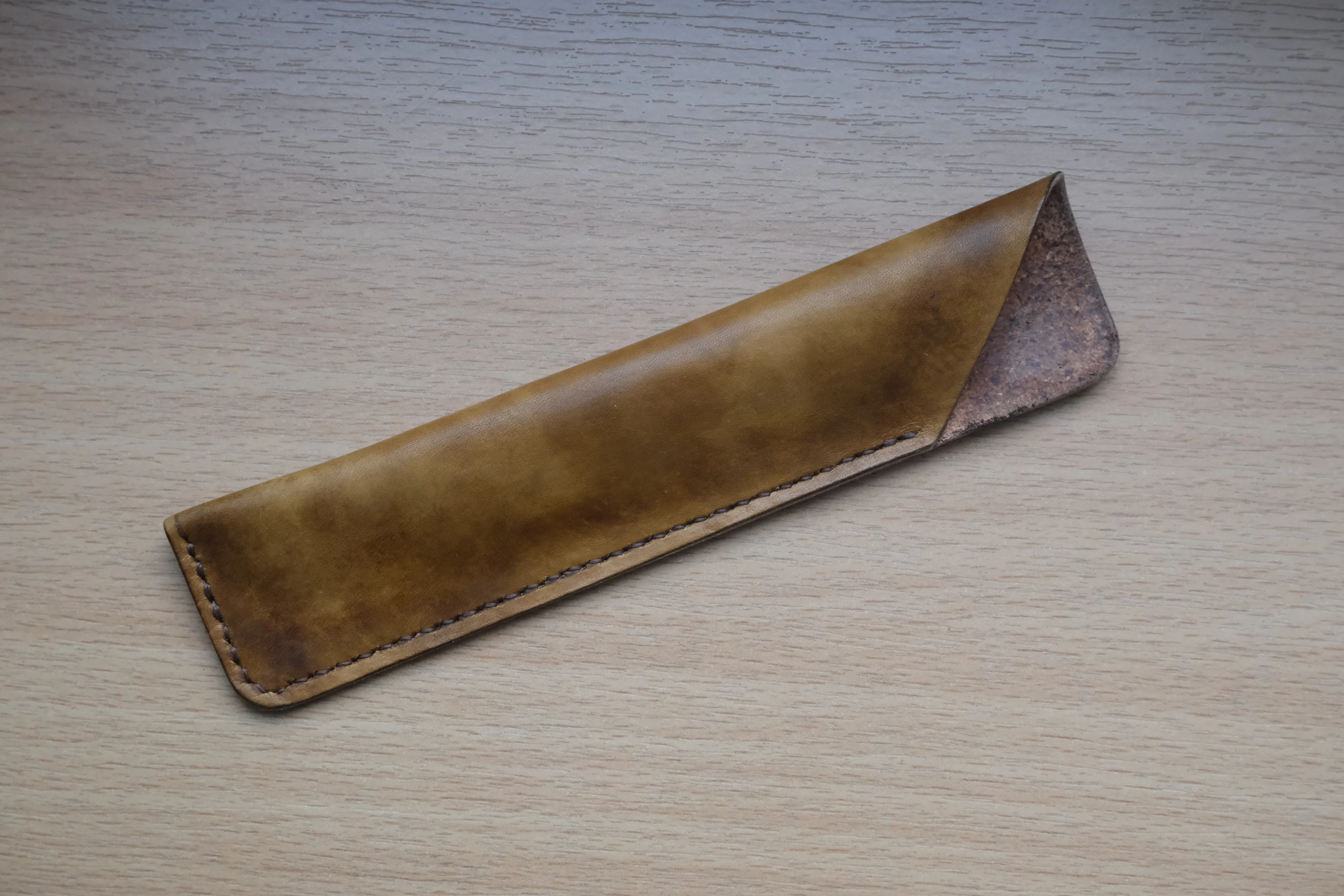 This pen case is handcrafted from natural vegetable tanned leather and hand dyed to a warm brown tone. Each piece is slightly different, reflecting the manual process and the natural character of the leather.