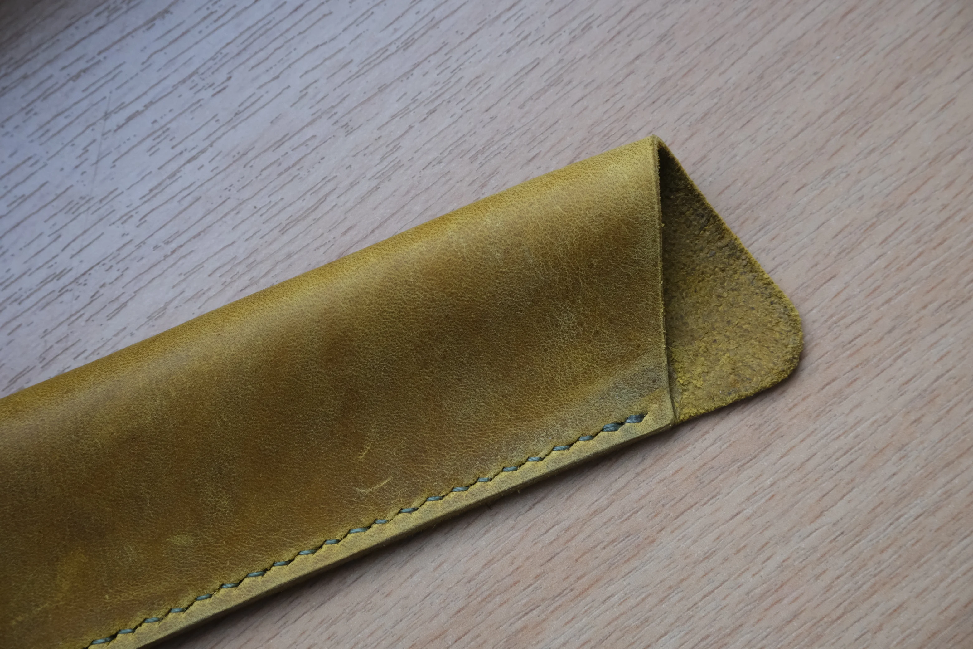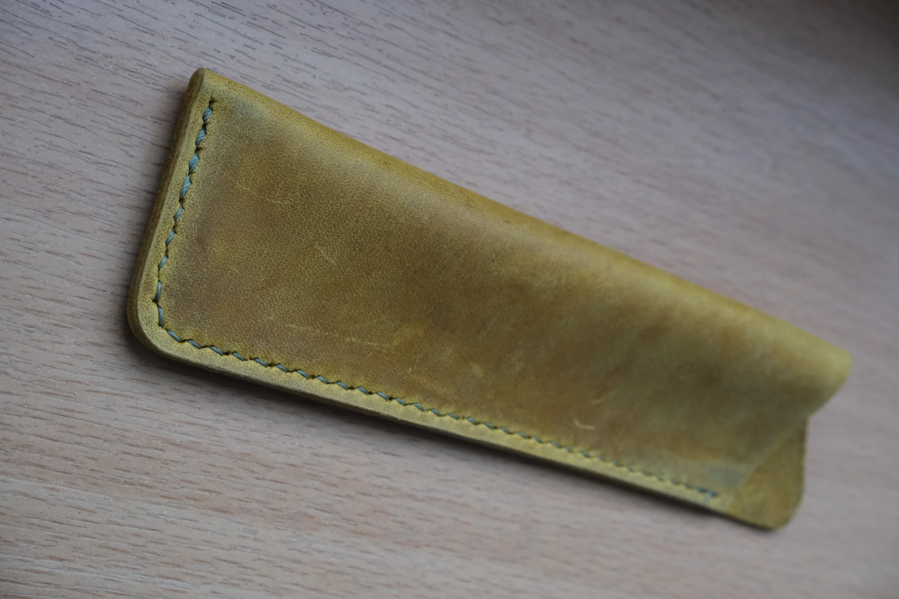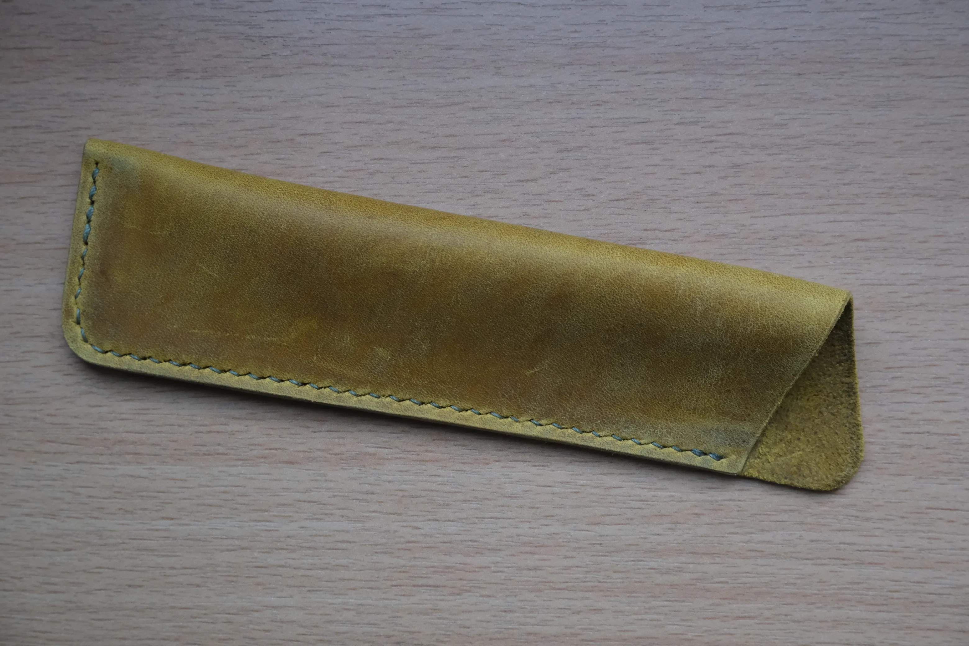 Protect your favorite fountain pen with this handmade leather pen case, crafted for everyday use and long-term durability. Made from yellow Crazy Horse leather, this pen sleeve develops a rich, unique patina over time, making every piece truly one of a kind.